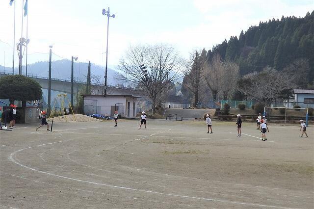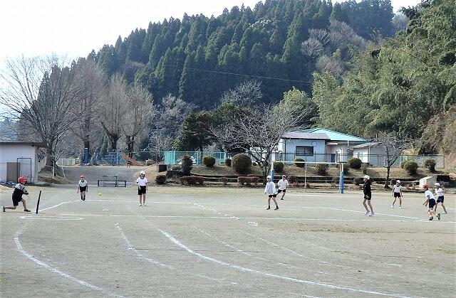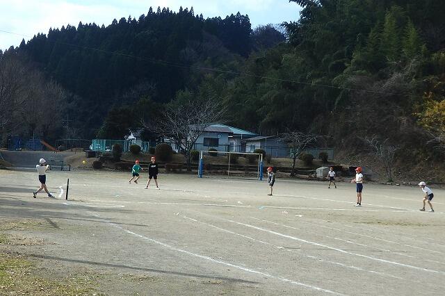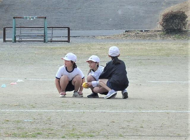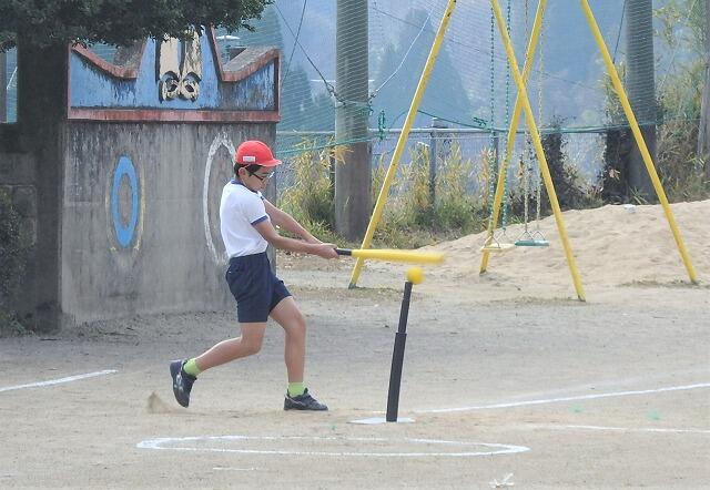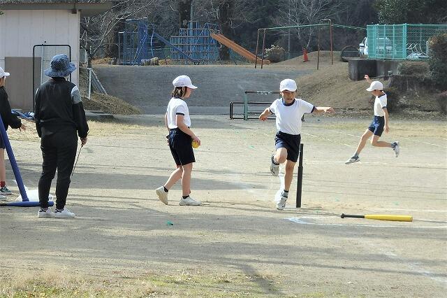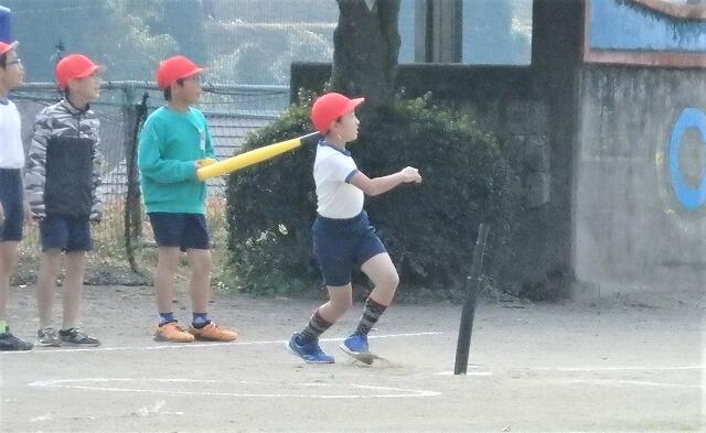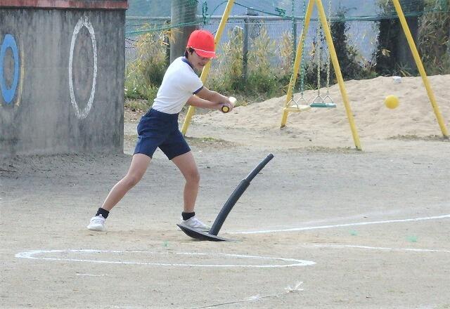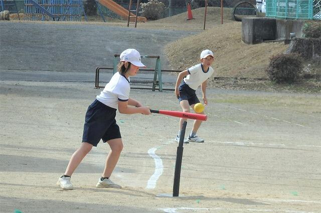 4年生と5年生が、体育の授業で「ティーボール」をしています。