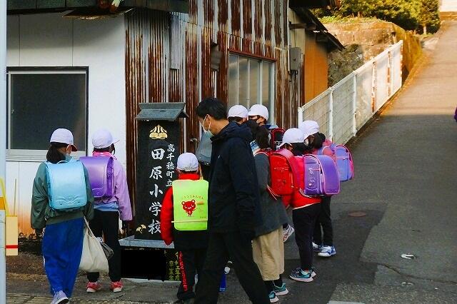登校した田原っ子たち、新たな標柱に 感動の声をあげていました。