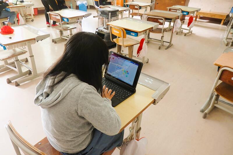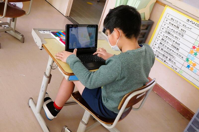 国語科の授業中、タブレット端末を使って活動しています。