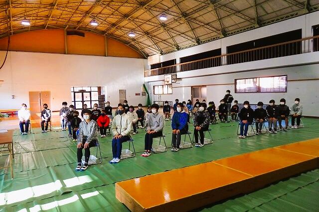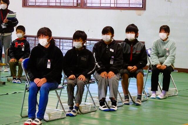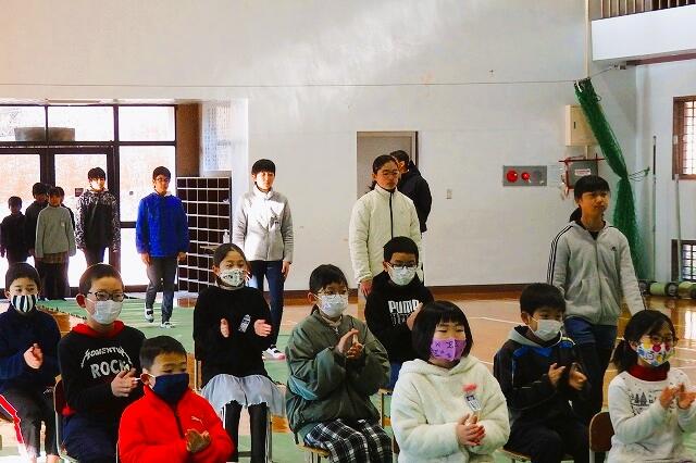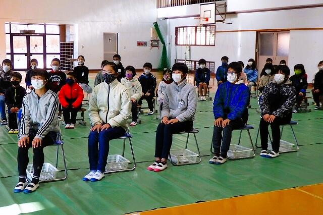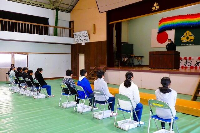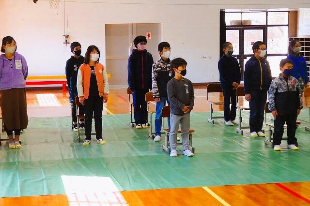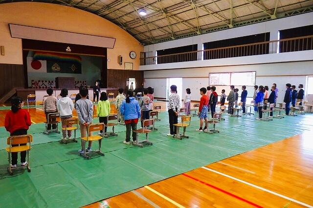1年生から5年生が、体育館で卒業式の歌の練習をしています。