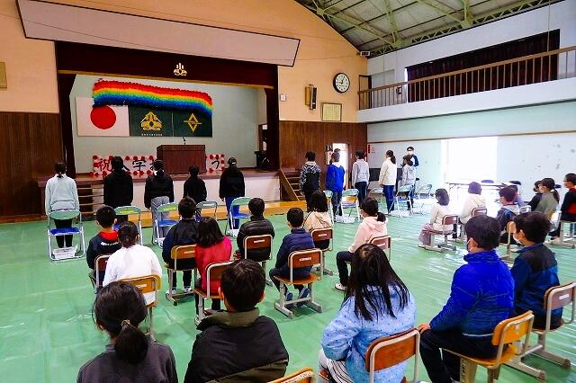 田原小学校では、1年生から5年生まで、在校生全員で卒業生を見送ります。