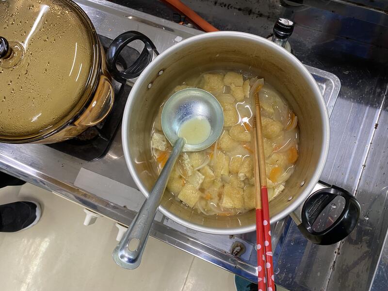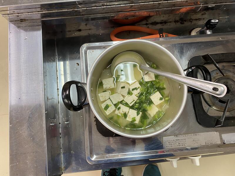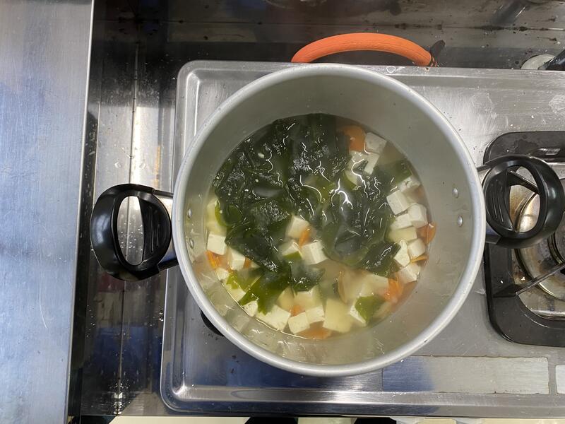 みそ汁に入れる野菜の皮むきを行い、包丁で切り分けました。