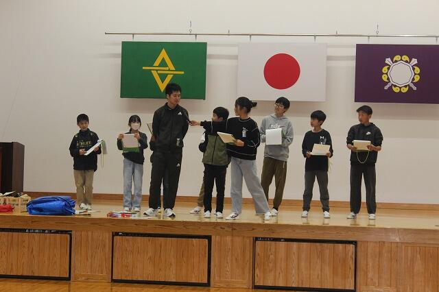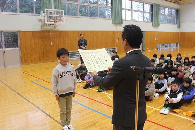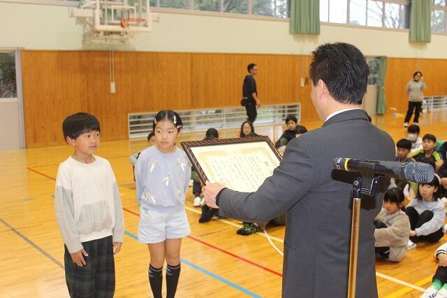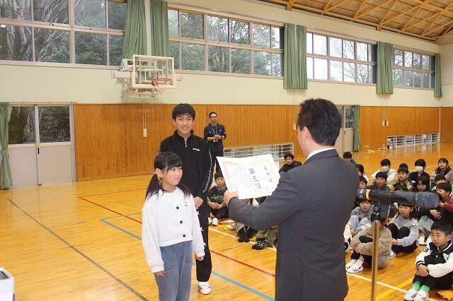 2月27日(金)にお別れ集会と表彰を行いました。表彰では、第11回雪だるまCUP小学生バレーボール大会で6年馬原逢人さんが優秀選手賞、第30回神話の里かぐら面争奪小学生バレーボール大会男子の部で神都JVCが第3位、第54回JA共済全国小・中学生交通安全ポスターコンクールで3年竹尾維悦さんが銀賞に入賞しました。また、令和7年度高千穂町子育て応援「ゆい高千穂」事業がまだせ若竹会議生活リズム募集のポスター制作の部で4年中西泉月さんががまだせ若竹大賞、6年富髙匠馬さん、3年佐藤永舵さんが入賞しました。三行詩小学校低学年の部では2年工藤涼花さん、3年工藤來大さん、3年甲斐雅裕さん、3年甲斐向琉さん、高学年の部で5年木下創介さん、6年工藤瑞季さんが入賞し、代表で瑞季さんを表彰しました。最後に、第13回全国小・中学校リズムダンスふれあいコンクール自由振付曲小学生部門で第3位を受賞した3年生を表彰しました。入賞したみなさんおめでとうございます。そして、昨年までベルマークを集めていましたが、数年間で貯めたベルマークで車椅子、コンディションセンサー、カメラを購入しました。長年にわたり、ベルマーク収集にご協力いただきありがとうございました。