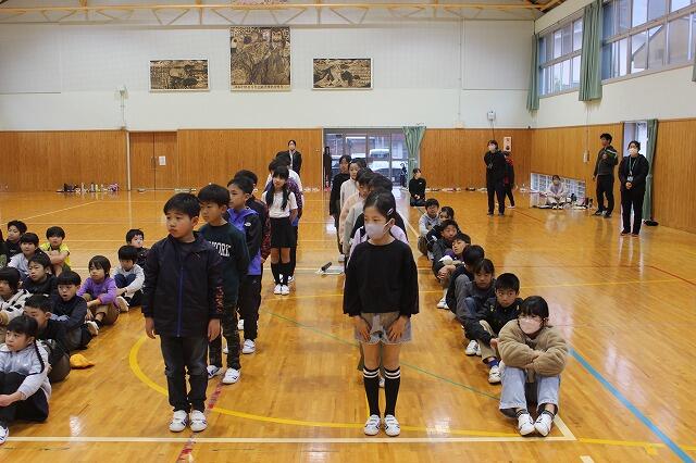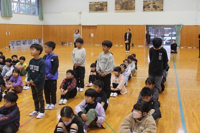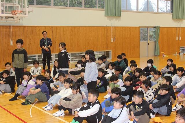 お別れ集会は5年生が進行し、まず、全校で校内かくれんぼを行いました。最後まで見つからなかったのは、6年の富髙匠馬さんと生見先生でした。その後、1~5年生全員で作成した御礼の手紙を6年生に渡しました。6年生、これまで岩戸小を引っ張ってくれてありがとうございました。