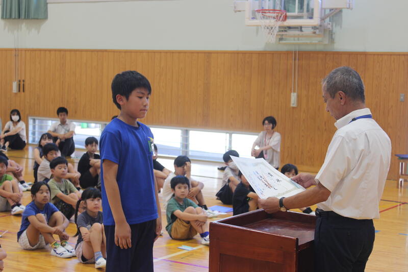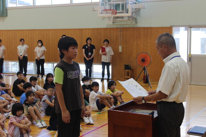 7月18日(金)に1学期の終業式を実施しました。まず、2年生の工藤涼花さんが1学期の反省を発表しました。その後に古賀校長先生から1学期の始業式で全児童に話した「自分も他の人(友達、家族、先生)も大切にしましょう。」が守れたのかの確認がありました。そして、夏休み中には、必ず自分で命を守る、お家の人の言うことをよく聞き実行して、2学期元気に会いましょうという話がありました。終業式の後には表彰があり、まず、ファイティングオープントーナメント第20回全九州空手道選手権大会初級クラスで優勝した6年の佐藤優心さん、次に第61回宮崎県スポーツ少年団中央大会ソフトボール競技で1位に輝いたスピリッツソフトボールクラブスポーツ少年団、表彰おめでとうございました。