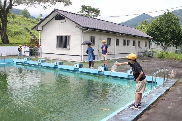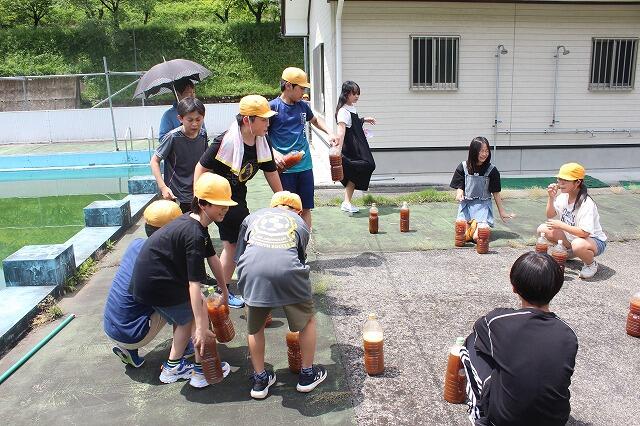 5月22日(木)の昼休みにEM液のプールへの投入をしました。高千穂町商工会女性部の工藤さんの指導の下、4月28日につくったEM液をプールに投入しました。これで安心して6月11日(水)にプール清掃を実施することができます。