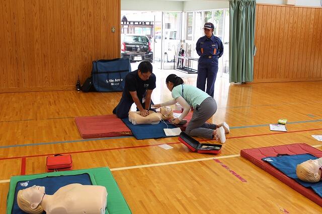 7月8日(火)に第1回学校保健委員会を開催しました。今回は、西臼杵消防本部の佐藤光陽さんを講師に迎え、心肺蘇生法の研修をしていただきました。7月22日から25日までのプール開放では、保護者にプール監視をしていただくので、今回の研修を企画しました。11名の保護者に参加していただき、心肺蘇生法やAEDの使い方、熱中症への対応などについて研修しました。事故が起こらないのが一番ですが、いざという時の対応法をしっかり学ぶことができました。