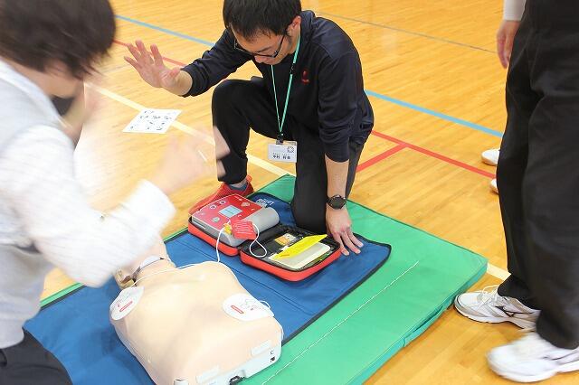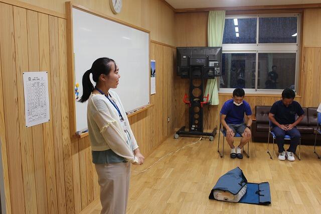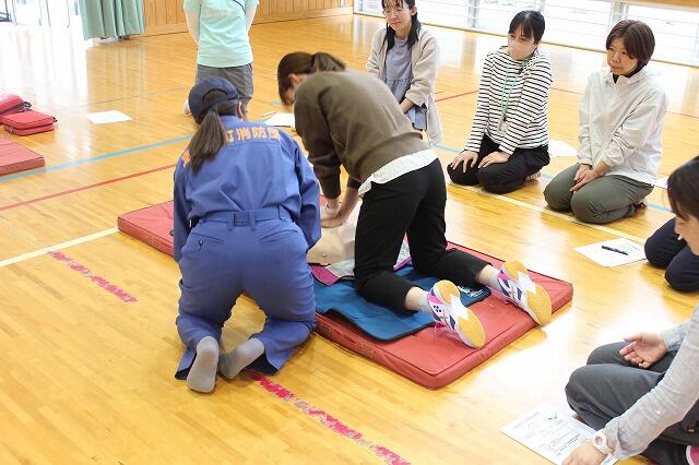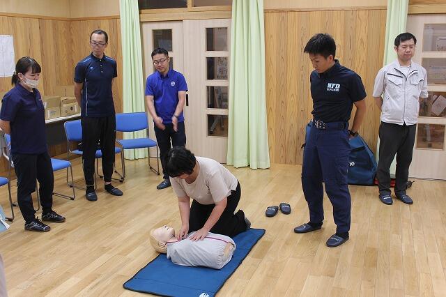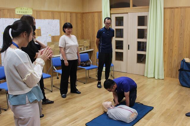 5月26日(月)に職員研修として心肺蘇生法の講習会を実施しました。講師に西臼杵広域行政消防本部の甲斐さんと高千穂町消防団の竹次さんを迎え、心臓マッサージや人工呼吸、AEDの使い方などを学習しました。その後に、熱中症やけいれんが起こった場合の対処法についても研修しました。本日研修した内容をいざという時のために準備していきたいです。