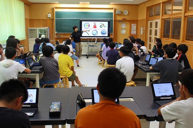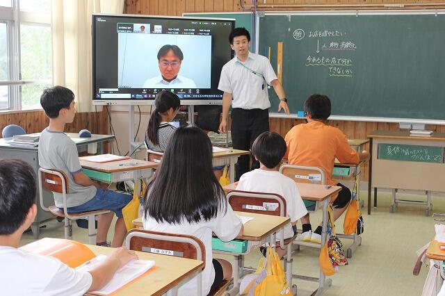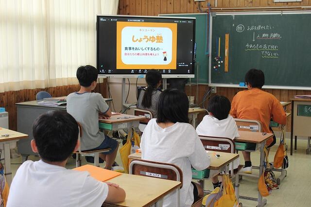 7月10日(木)の6校時に「プロフェッショナルを全ての学校に」の企画で東京のキッコーマンの本社とネットワークでつないで遠隔授業「しょうゆ塾」を実施しました。しょうゆ塾では、「しょうゆがどのようにつくられているのか」、「どのような製品にしょうゆがつかわれているのか」について丁寧に説明していただきました。次回は、9月18日(木)に開催される予定です。