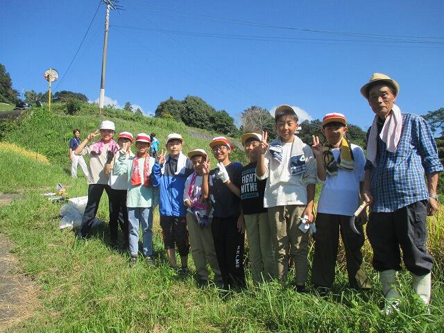 10月7日(火)に5年生が稲刈りをしました。田んぼを借りたり、管理していただいたりしている佐藤重昭さんをはじめJA青年部の協力を得て、稲刈りをしました。刈った稲は6束ほどをひとまとめにして、掛け干しをしました。2週間ぐらい経つと、脱穀の作業ができるそうです。2週間後が楽しみです。