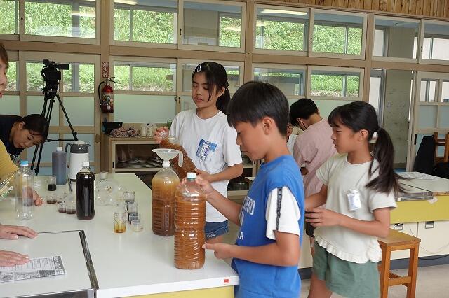 10月14日(火)の1校時に5年生がEM液作りを実施しました。高千穂町商工会女性部の方を講師に迎え、EM液が環境に与えるよい影響のことやEM液の作り方を丁寧に教えていただきました。EM液を投入後、プール清掃を行うことによって、自然環境の保全や地球を守ることにつながることを学習しました。今回つくったEM液は、10月30日(木)にプールに投入する予定です。