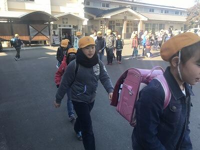 いよいよお別れ遠足に出発です。6年生は1年生と手を繋いで、2年生は5年生と手を繋いでの出発です。お昼は、神楽の館の広場で食べる予定です。6年生とのいい思い出をたくさんつくりましょう。