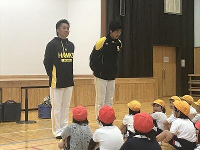 2月22日(金)ソフトバンクから2名の指導者に来ていただき、キャッチボールキャラバンを行っていただきました。岩戸小学校の2年生と押方小学校の2年生が参加しました。帆足選手と東方選手に楽しく野球を教えていただきました。当日は参観日ということもあり、多くの保護者も楽しくその様子を見守りました。