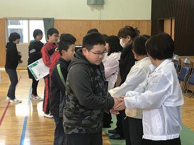 3月15日(金)、毎年卒業生に対して行われる岩戸地区の更生保護女性会からの記念品贈呈式がありました。7名の女性会の方々が来校され卒業生に素敵なプレゼントをいただきました。