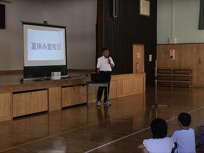 7月19日(金)令和元年度第1学期の終業式が行われました。最初に3年生と5年生の作文発表がありました。その後、校長先生から1学期を振り返ってお話があり、校歌斉唱で1学期を締めくくりました。そして学習部・生徒指導部・保健体育部の先生方から夏休みの過ごし方についてお話がありました。最後に多読賞の表彰がありました。
