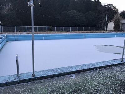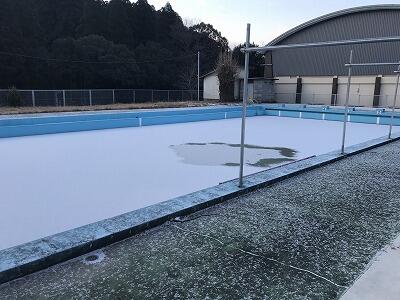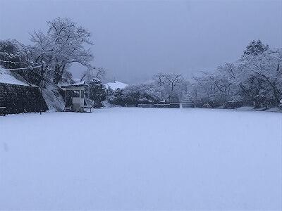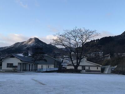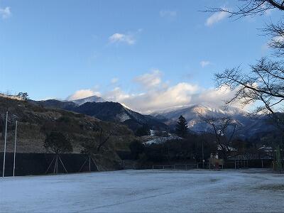 水曜日から降り続いた雪もようやく落ち着いた12日(金)の朝の風景です。岩戸小学校の校庭から見える山々も雪化粧しています。プールも真っ白です。