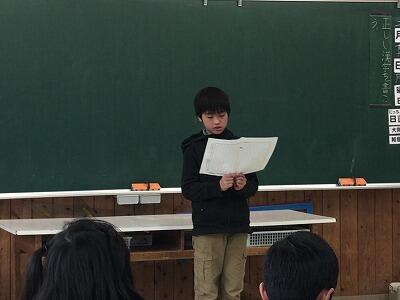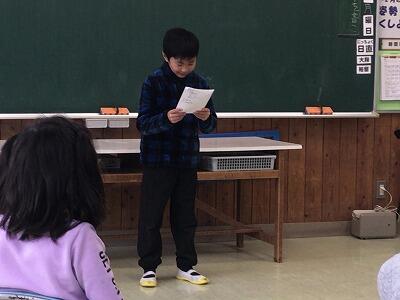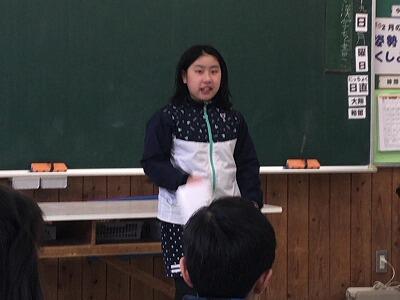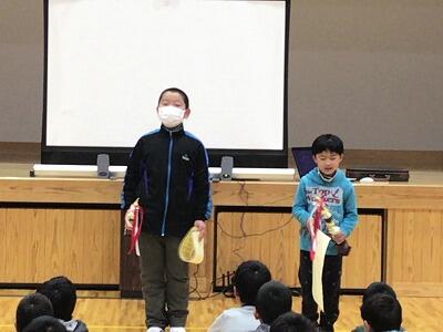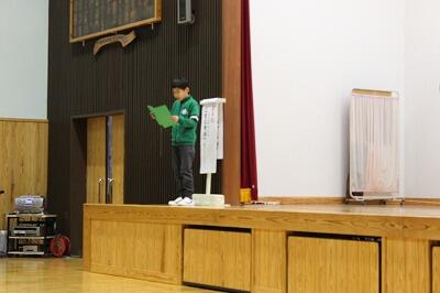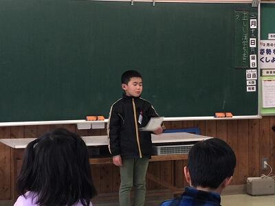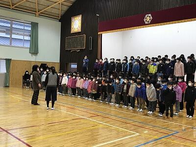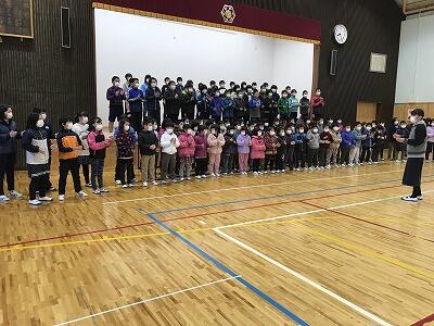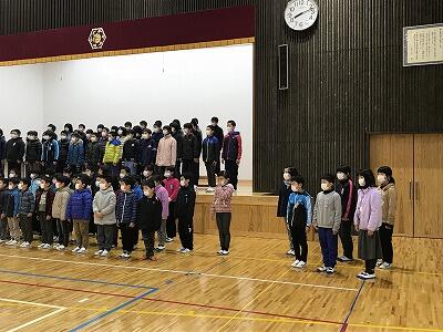 今日、3学期の始業式が行われました。転入生もあり、116名での3学期がスターとしました。2名の児童の作文発表があり新年の抱負を立派に述べてくれました。校長先生より「次の学年へ向けて振り返ったときに『頑張った』と胸を張れるような取組にしていきましょう」とお話がありました。頑張る3学期にしていきましょう。