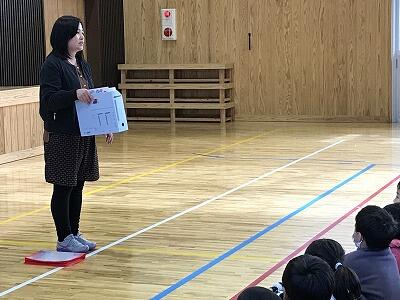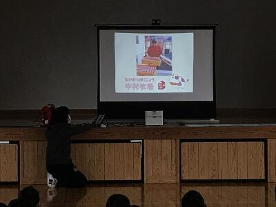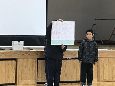 今日は、給食感謝集会が行われました。健康委員会の進行で、岩戸小学校の給食がどのようにして作られているのかをクイズ形式で説明してくれました。