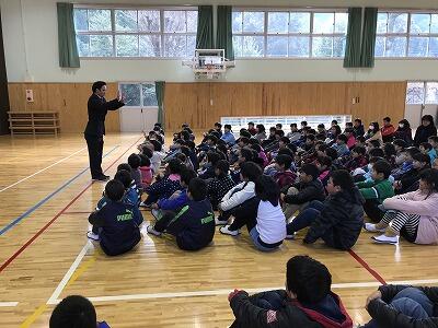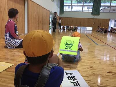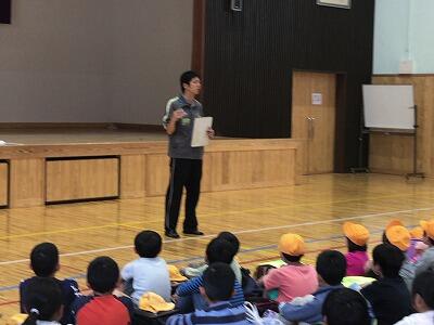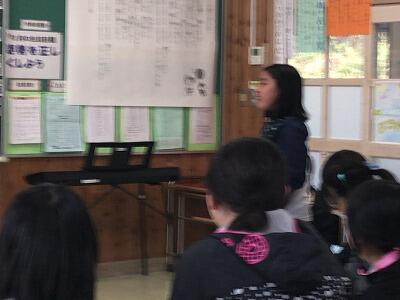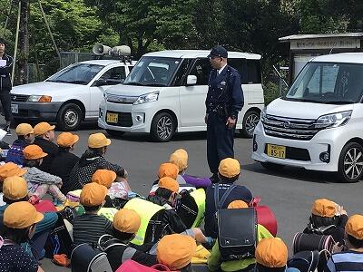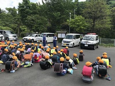 本日、交通安全教室が行われました。駐在所のおまわりさんと交通安全指導員の2名に来ていただき指導していただきました。毎日通り慣れている道路ですが、横断歩道の歩き方を再度確認しました。ゴールデンウィークには多くの車が岩戸地区に来ますので、交通安全に気をつけるようにご家庭でもご指導ください。