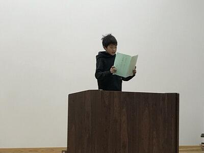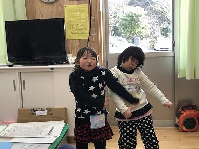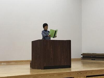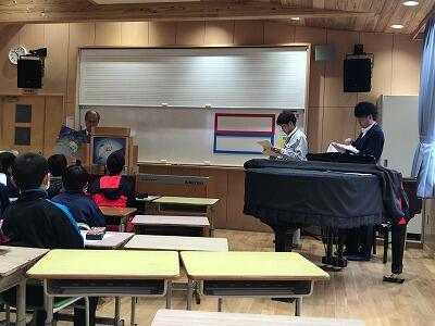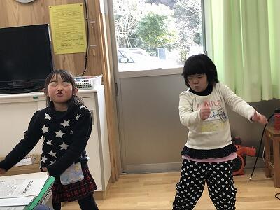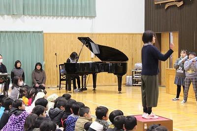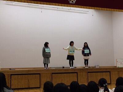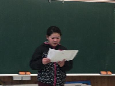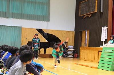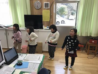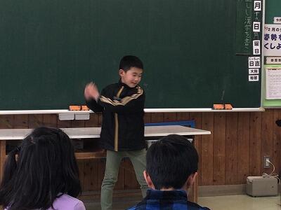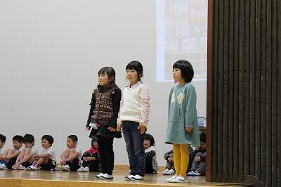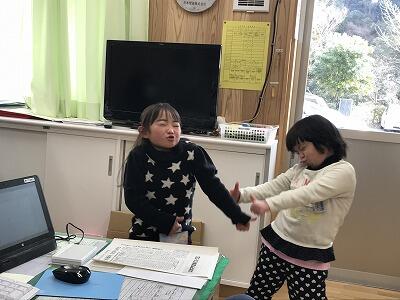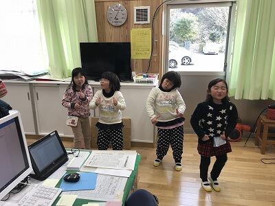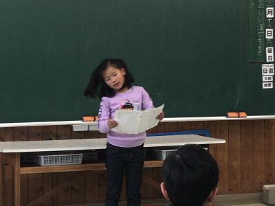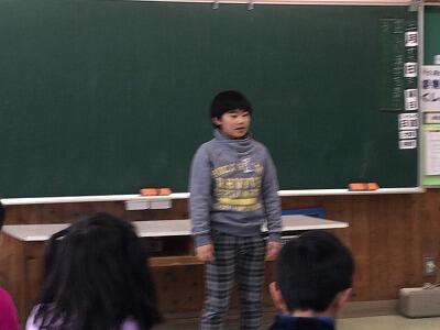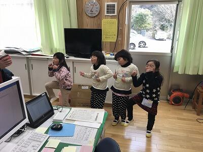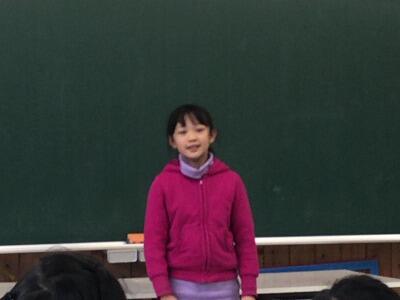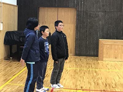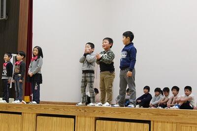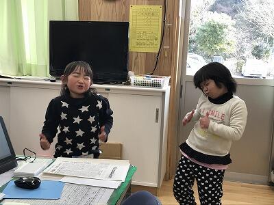 2月4日の学習発表会に向けて各学年練習を行っています。昼休みに練習の成果を職員室に来て披露してくれました。1年生です。