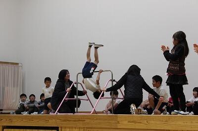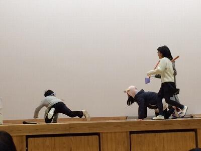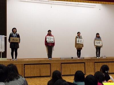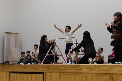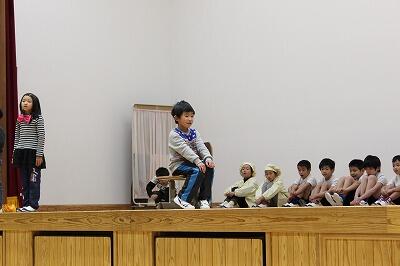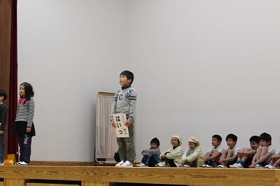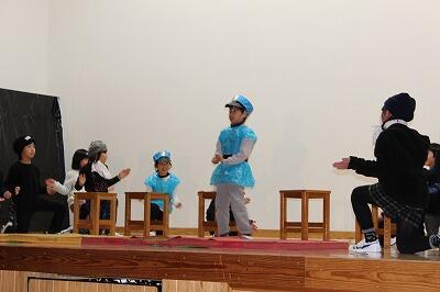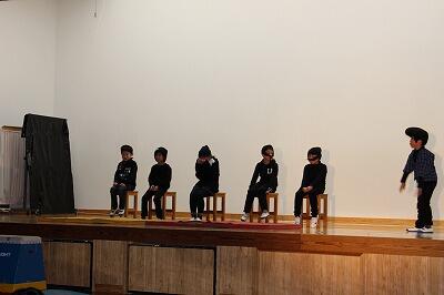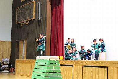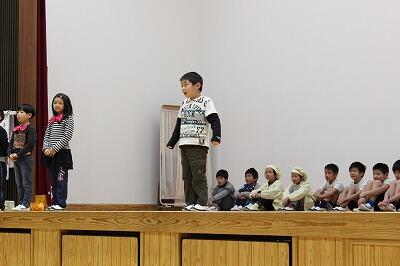 1年生22名による劇が熱演されました。全員が登場して、自分の得意なところを元気よく表現する姿に引き込まれる劇でした。