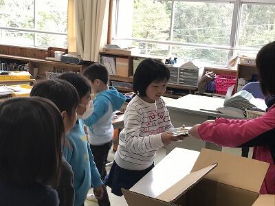 3年生に花王からのプレゼントが届きました。歯磨き粉とノートをプレゼントしていただきました。学級での贈呈式の様子です。