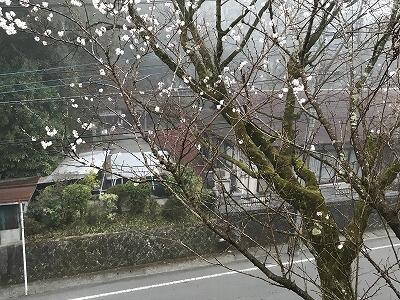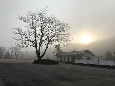 気がつくと体育館裏にある桜が咲いていました。少しずつ春がやってきています。今朝の朝は霧の中に朝陽が出ていてきれいでした。