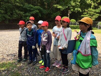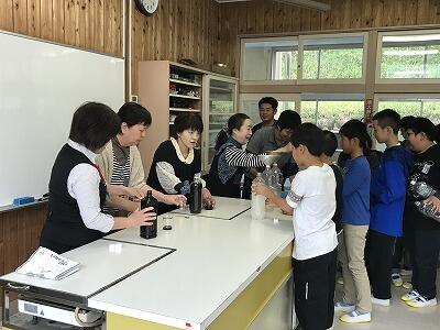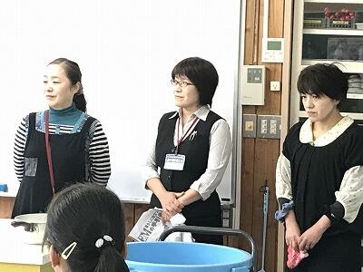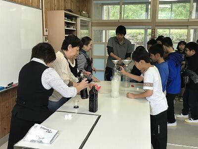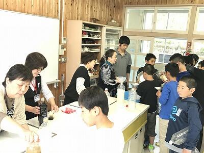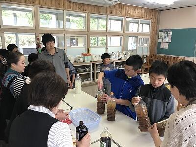 今日は岩戸商工会婦人部より4人の講師の方々がいらしゃってEM菌の効果に関する授業を行いました。6年生14人がプールに投入するためのEM菌の溶液をつくりました。