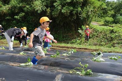 雨上がり、子どもたちが植えた花が、少しずつ大きく成長しています。夏頃には、花壇ぎっしりの花が咲くことでしょう。