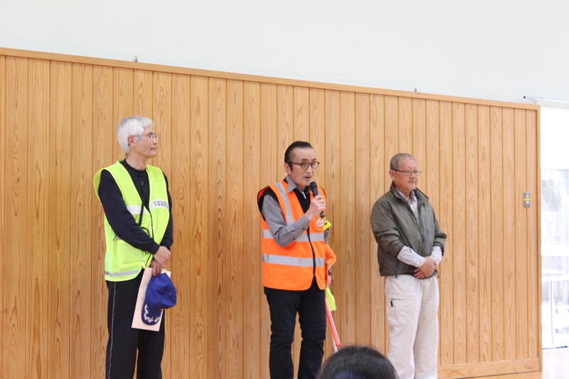 まずは、「見守り隊」の方に感謝の言葉を全校児童から伝えた後に、交通指導員の方にボードを使って分かりやすく道路を通行するときの注意点を教えていただきました。