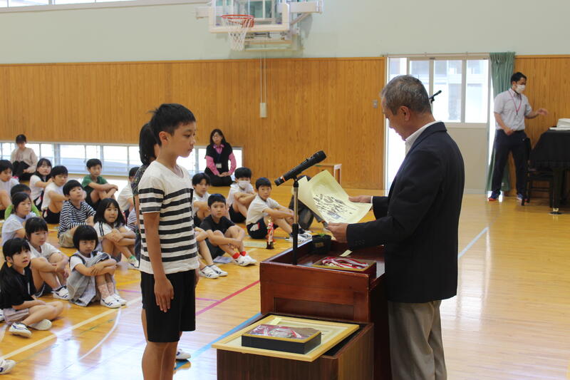 6月7日(金)の朝の時間に全校朝会が行われました。まず、校長先生の話で、花の苗植えについての話がありました。今週は、3~6年で校長先生と一緒に花壇に花の苗植えを行いました。「花の苗は、お世話をしっかりしないと上手く育ちません。草抜きなどみんなでしっかりお世話をしましょう。」という話がありました。その後に表彰がありました。まず、第85回春季親善ソフトボール大会でスピリッツスポーツ少年団が敢闘賞を5年の竹尾心希さんが優秀選手賞を受賞しました。また、第4回熊本県極真空手交流大会上級小学6年の部で6年の田尻大知さんが3位、中級小学3年の部で3年の馬原璃空さんが準優勝に輝きました。おめでとうございます。最後に今週から来校することになった図書担当事務職員の下堂薗ゆり先生の紹介がありました。これから金曜日に図書室に行くのがより一層楽しみになりました。