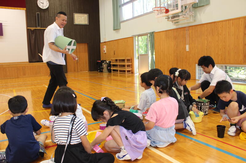 6月13日(木)に岩戸小学校の創立150周年を盛り上げる事業の1つとして、リズムワークショップを行いました。元ブルーハーツのドラマーである梶原徹也さんをお招きして、2・3校時に1・2年生、5・6校時に3~6年生がリズムワークショップを行いました。まずは、プラスチック製のバケツやゴミ箱と布テープを使って自作の太鼓を作りました。それから梶原さんの太鼓に合わせて、いろいろなリズムを刻んだり、走り回ったり、飛び跳ねたり、体全体で表現することを楽しむことができました。最後に、梶原さんのドラムソロを聴いたり、神楽の太鼓とドラムとのコラボレーションを楽しんだりしました。岩戸小学校の創立150周年を祝うよい行事となりました。