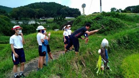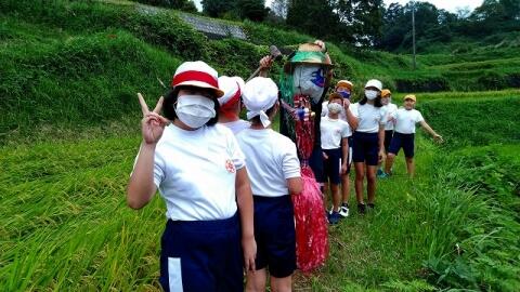 9月22日(水) 5年生は自分たちで作ったかかしを田んぼに立てに行きました。6月に苗を植えた稲には実が入り、稲穂を垂らしていました。作物を荒らす鳥などの害獣を追い払うため、5年生が協力して作った3体のかかしが、これからしっかりと田んぼのお米を見守ってくれれることでしょう。収穫が楽しみです。
