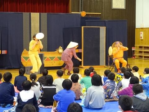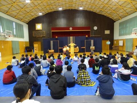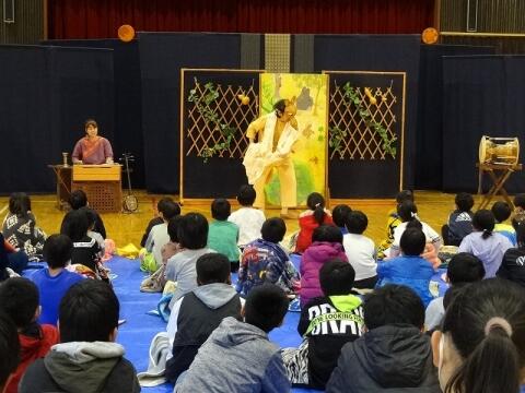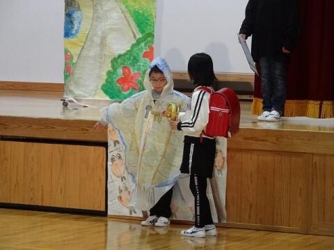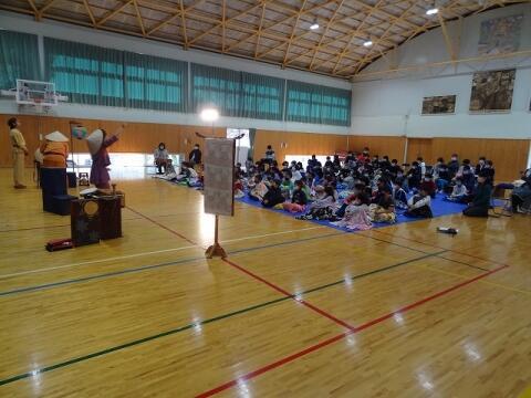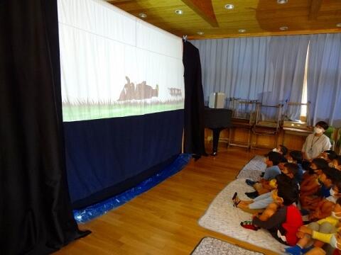 ◎1・2年生は、読み聞かせの会「がらがらどん」による影絵シアターと保護者の方達との昔の遊びをしました。