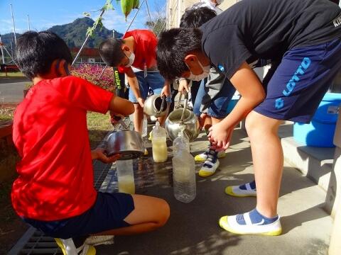 ◎ぬかを入れた水をヤカンに注ぎ分ける