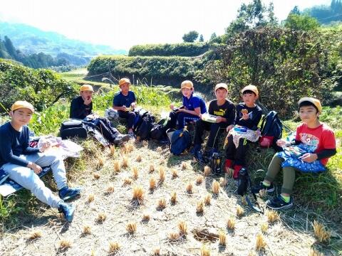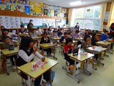 10月28日(木) 秋の遠足を実施しました。1・2年生はAコープ岩戸店でおやつを買って、旧岩戸中学校跡地へ行きお弁当を食べました。3・4年生は神楽面工房と泉福寺を見学し、神楽の館でお弁当にしました。5年生はインターネットを使ってテレビ宮崎と日本航空をリモート見学した後、先日稲刈りをした田んぼでお弁当を食べ、干していた稲を脱穀しました。天気に恵まれ、最高の遠足となりました。