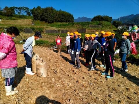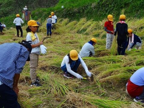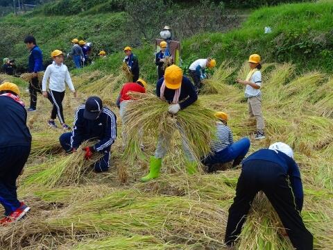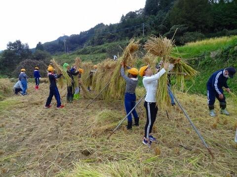 10月13日(水) 5・6校時に5年生が稲刈り体験をしました。穂が重たかったのか稲はほとんど倒れていましたが、鎌を使ってみんなで刈り取りました。刈り取った稲は束にしてひもで結び、それから竹竿にかけ、最後に上にビニールをかけました。2週間ほど干してから脱穀をします。