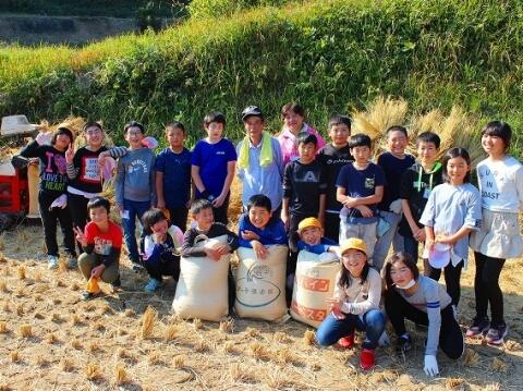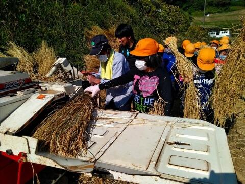 10月28日(木) 秋の遠足の日の午後、5年生はお米体験学習の最後となる「脱穀」をしました。約2週間前に天日干しにしていた稲をハーベスターという機械にかけて籾(モミ)にしました。6月の田植えから稲刈り、脱穀まで体験させていただいた佐藤重昭様を始め、これまでご協力いただいた保護者の皆様、ありがとうございました。