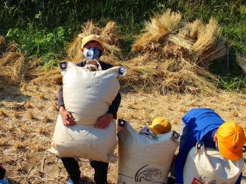 ◎最後に収穫した3袋の籾と一緒に記念写真を撮りました。