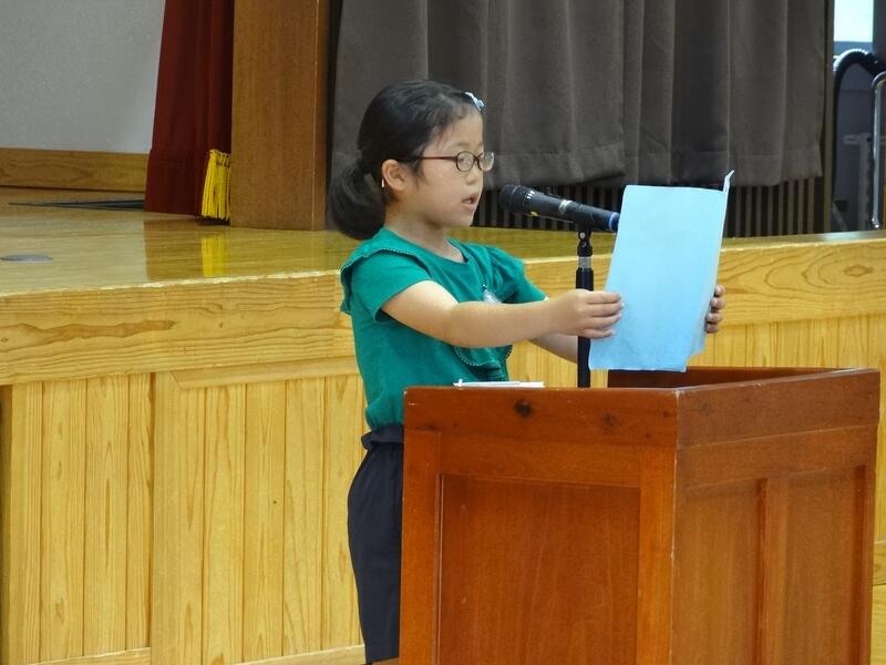◎3年生代表児童による作文発表 「1学期は、発表、自学、さわやかなあいさつを頑張りました。2学期は3つ以外にもいろいろ頑張りたい。」
