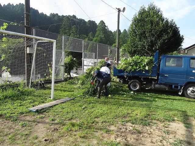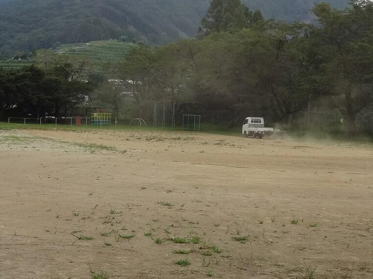 8月24日(水)の夕方、次の日曜日の環境整備作業を前に、主な役員さんで校舎裏の草刈りと運動場の整地をしていただきました。今年の夏の暑さは土手の草を大きく成長させています。
