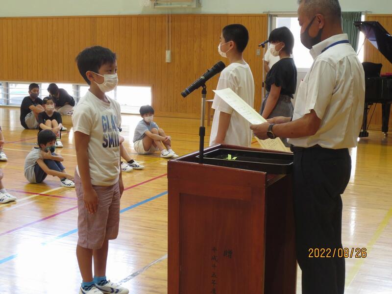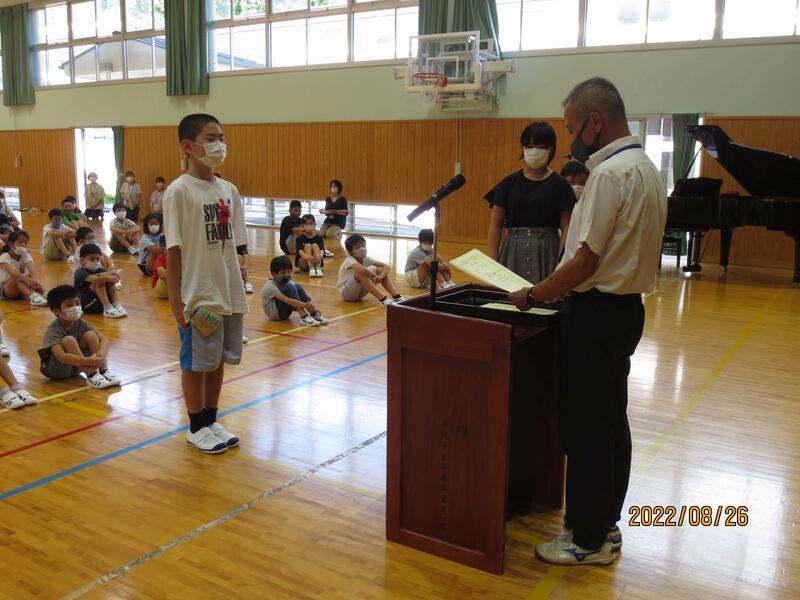 8月26日(金) 1校時に第2学期始業式を行い、2学期が始まりました。2年生と4年生の代表児童が2学期に頑張ることを発表しました。校長は、夏休み中の先生達の学びのことを伝え、2学期も子どもたちも先生たちも一緒に頑張っていこうと話しました。また、生徒指導部は「あいさつ運動」について、保健体育部は「決まり正しい生活習慣」について話しました。