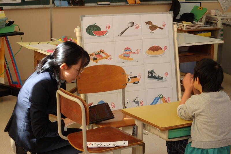タブレット端末から出される生成AIの発音を視聴して、「す」の発音ビンゴゲームをしました。