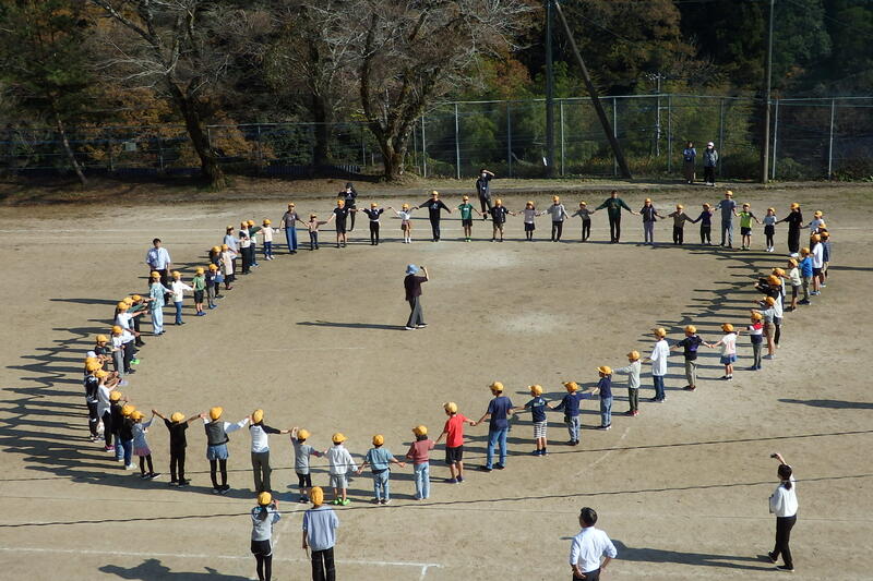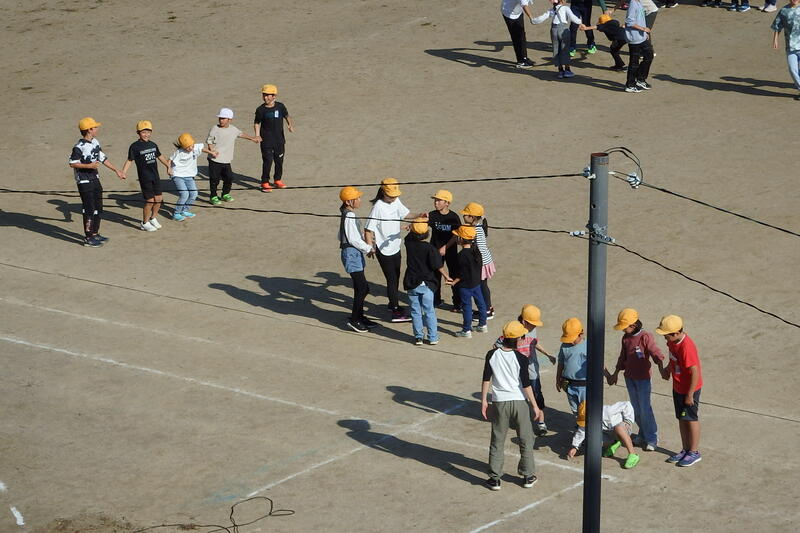 全校児童が一つの輪になり、指示とは逆の行動(「前」と言われたら「後ろ」に移動など)をする活動をしました。
