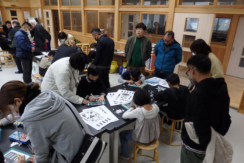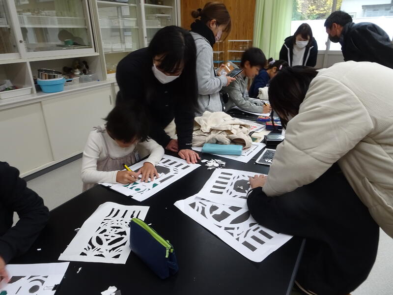 3年生と4年生は、夜神楽で奉仕者(ほしゃどん)が舞う舞台・神庭(こうにわ)の四方に飾られる切り絵のような「彫り物(えりもの)」づくりを行いました。