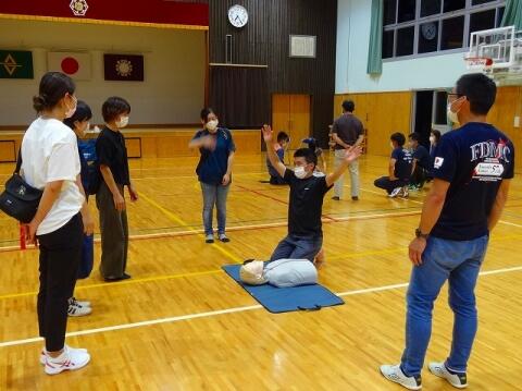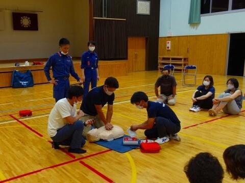 7月8日(水) 第1回家庭教育学級及び学校保健委員会合同研修会で、西臼杵広域行政事務組合消防署の佐藤様、高千穂町消防団の木野様を講師に、心肺蘇生法について研修を行いました。専用の人形を使って胸骨圧迫の方法やAEDの使い方などについて学びました。