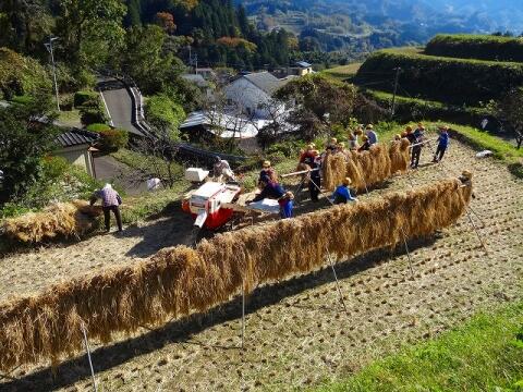 10月26日(月) 5・6校時に「稲刈り」を体験しました。慣れない釜を持っての作業に苦労する児童もいましたが、何とか稲を刈り取って麻ひもで束ね、竹竿にかけていきました。大変な作業でしたが、最後までやり遂げることができました。