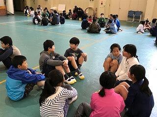 本日、運動会の結団式が行われました。じゃんけんをした後、A団の団長の蒼瑠さんがペットボトルを選んで、その後B団の団長の千公さんが残ったペットボトルを手にして、かけ声の後力一杯振ると団の色が現れました。A団は白、B団は赤です。その後リーダーの紹介、団付きの先生方の紹介がありました。写真はその様子です。