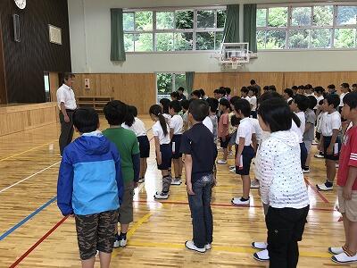 7月の保健目標は『夏を健康にすごそう』です。熱中症にならないために水分補給の方法や帽子の着用、そして規則正しい生活を送って『はやね・はやおき・朝ごはん』を実践することが各学級で説明されました。