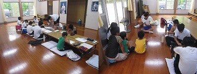 本校は、毎年夏休み初めに、自分の住んでいる地区の公民館に集まり、岩戸中学校の生徒と一緒に勉強をしています。今年も7月29日(月)に、各地区の公民館で行われました。